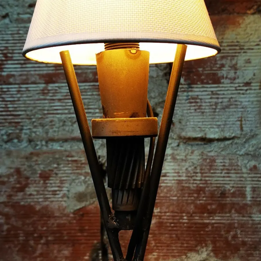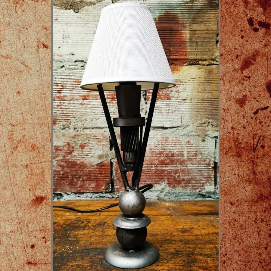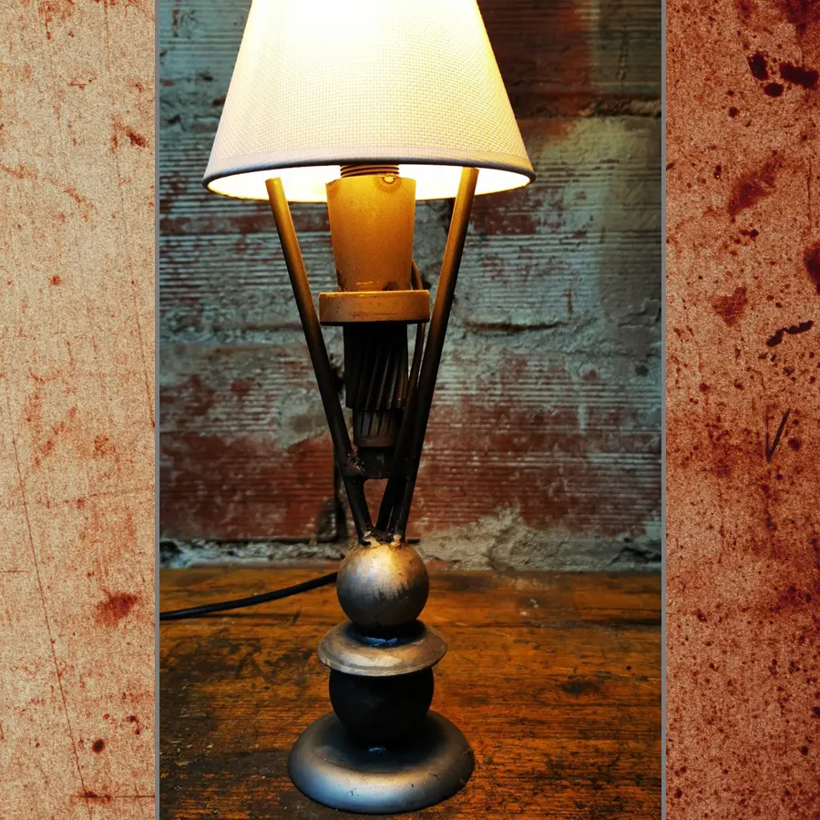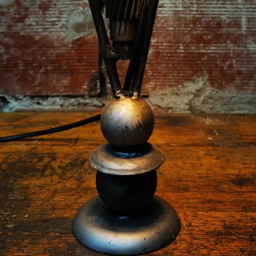 Per l'opera è stato usato come basamento un piatto in acciaio e due sfere in acciaio, per i fianchi due steli in ferro e come anima centrale una vite senza fine con un cuscinetto, infine un bicchierino in acciaio dove trova alloggio il porta lampade.