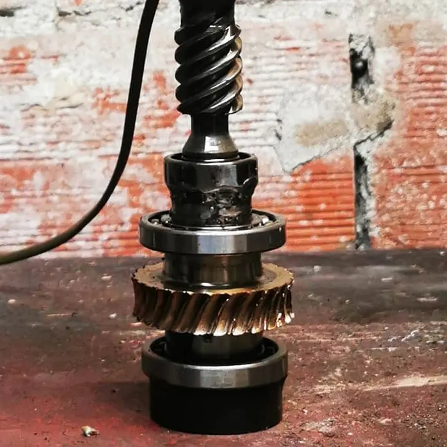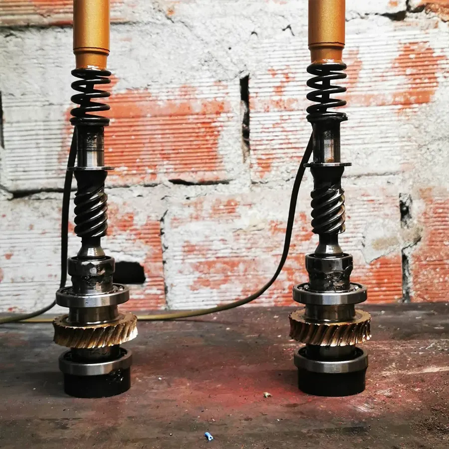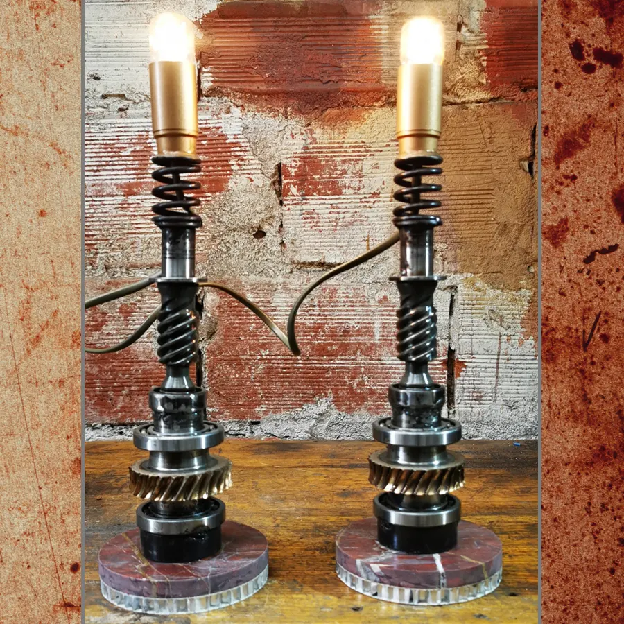 Due lampade in stile steampunk realizzate con ingranaggi da motovariatore, che contrastano elegantemente con l’acciaio. La base in marmo rosso aggiunge un tocco di design classico a questo stile unico.